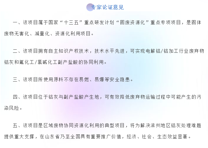與會專家聽取了建設企業(yè)及技術團隊對技術總體情況的匯報。在充分質(zhì)詢、討論后,專家一致認為,本項目技術路線合理、前期基礎扎實,可實現(xiàn)電解鋁/鋁加工鋁灰和副產(chǎn)鹽酸的協(xié)同利用,屬典型的資源循環(huán)利用項目。