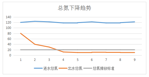 采用邁葳生化修復(fù)方案后,出水總氮由80mg/L持續(xù)下降,最終穩(wěn)定出水TN在10mg/L左右,達到一級B排放標(biāo)準(zhǔn)。